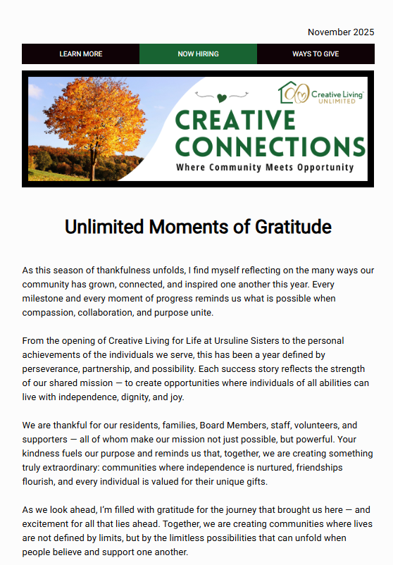 Creative Connections is the official newsletter of Creative Living Unlimited, designed to keep you informed and inspired! Each issue celebrates the achievements of the individuals we serve, highlights upcoming events, and shares heartwarming stories that showcase the impact of our work. Whether it’s a spotlight on community milestones, updates on our innovative programs, or a look at the lives we’re helping to transform, Creative Connections is your window into the heart of our organization. Stay connected, stay inspired, and celebrate with us as we create possibilities and foster independence.